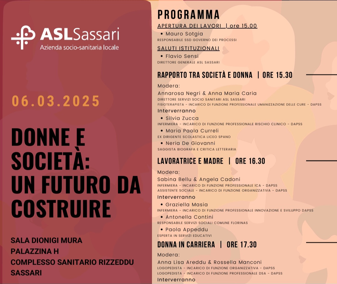 Durante la giornata verrà affrontato il tema delle politiche di conciliazione dei tempi di lavoro e la famiglia, con un focus sui nidi come sostegno alla donna lavoratrice; verranno inoltre presentat i risultati della Survey sul benessere organizzativo della Lavoratrice madre effettuata nella Asl di Sassari. Verrà inoltre approfondito il tema della leadership femminile, con una relazione sullo stile di leadership delle donne e su come questo si differenzi da quello maschile, con un focus su empatia, collaborazione e gestione del team. I relatori affronteranno il tema delle barriere culturali e strutturali che impediscono alle donne di accedere a posizioni di leadership. Verrà inoltre affrontato il tema, da un punto di vista scientifico, di soft skills, oltre ad un focus sulle barriere culturali e strutturali che impediscono alle donne di accedere a posizioni di leadership.